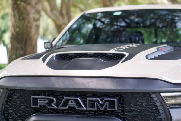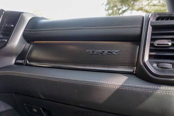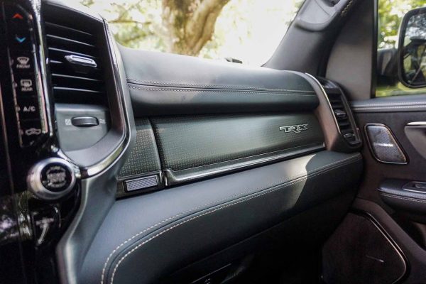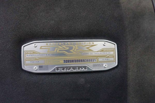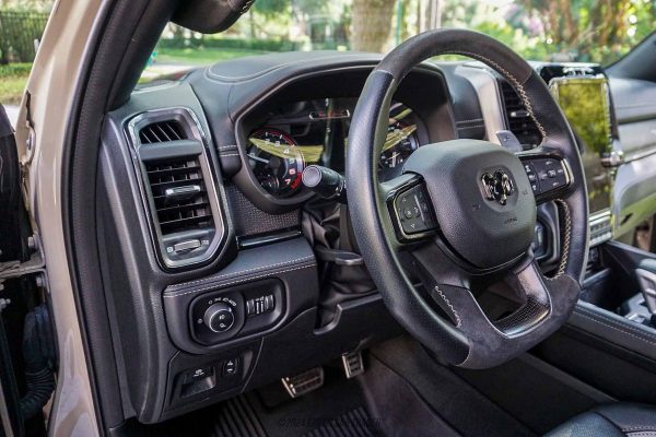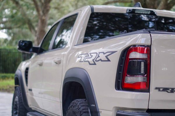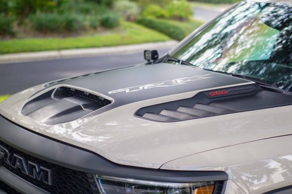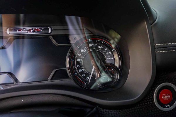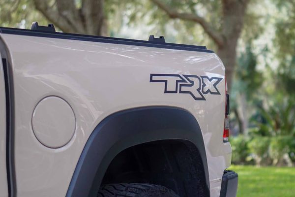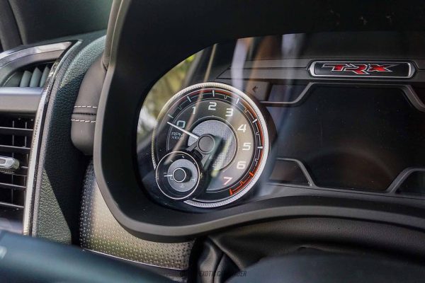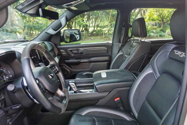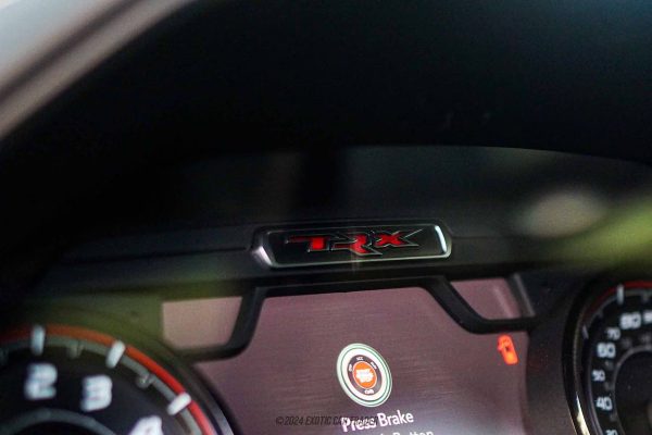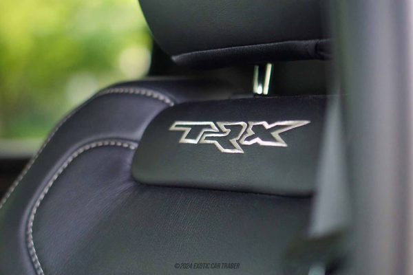 Additional options include the TRX Sandblast Edition, “TRX” Exterior Graphics by Mopar, and “TRX” Hood Graphics by Mopar. The interior features Real Carbon Fiber accents, a Leather and Carbon Flat-Bottom Steering Wheel, and Luxury Front Door Trim Panel.